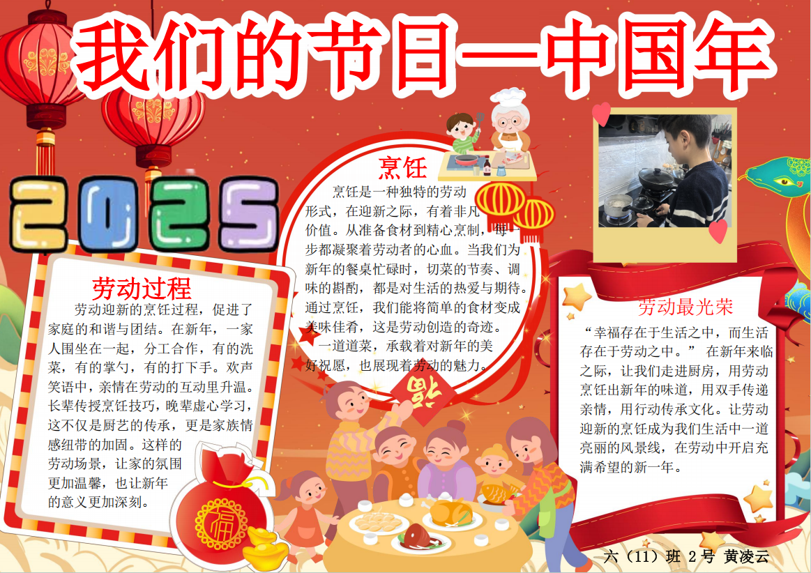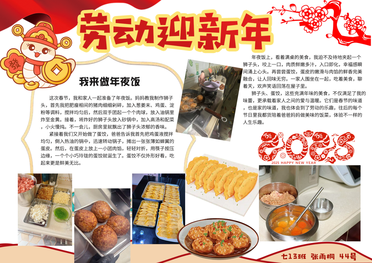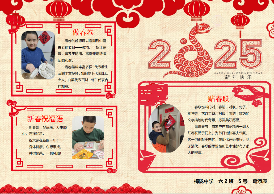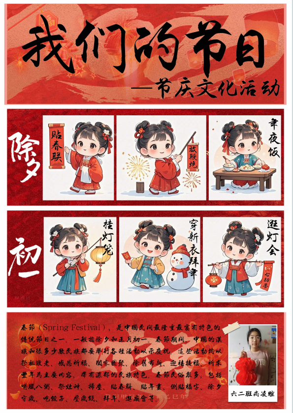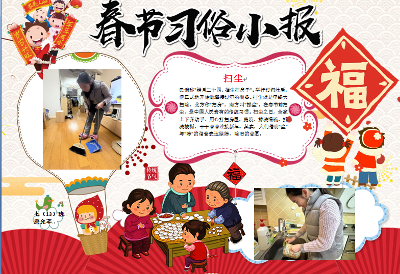 在春节这场民俗盛宴中,更多的同学们将自己的春节民俗实践经历绘制成电子小报与迎新小报,呈现自己对传统年俗文化的生动诠释。那些传统习俗,如劳动迎新时的忙碌身影、包饺子做馄饨的温馨场景、逛庙会时的热闹欢腾、放烟花时的绚丽瞬间,皆被同学们用灵动的笔触、丰富的色彩与精妙的文字,一一呈现在小报之上。喜庆的氛围跃然纸上,浓浓的年味扑面而来。每一份小报都是同学们对春节文化的独特理解,是他们对新年最美好的祝福,亦是对传统民俗文化的传承与弘扬。让我们一同欣赏这些小报,感受民俗文化的独特魅力,领略同学们笔下新春的无限生机与活力。