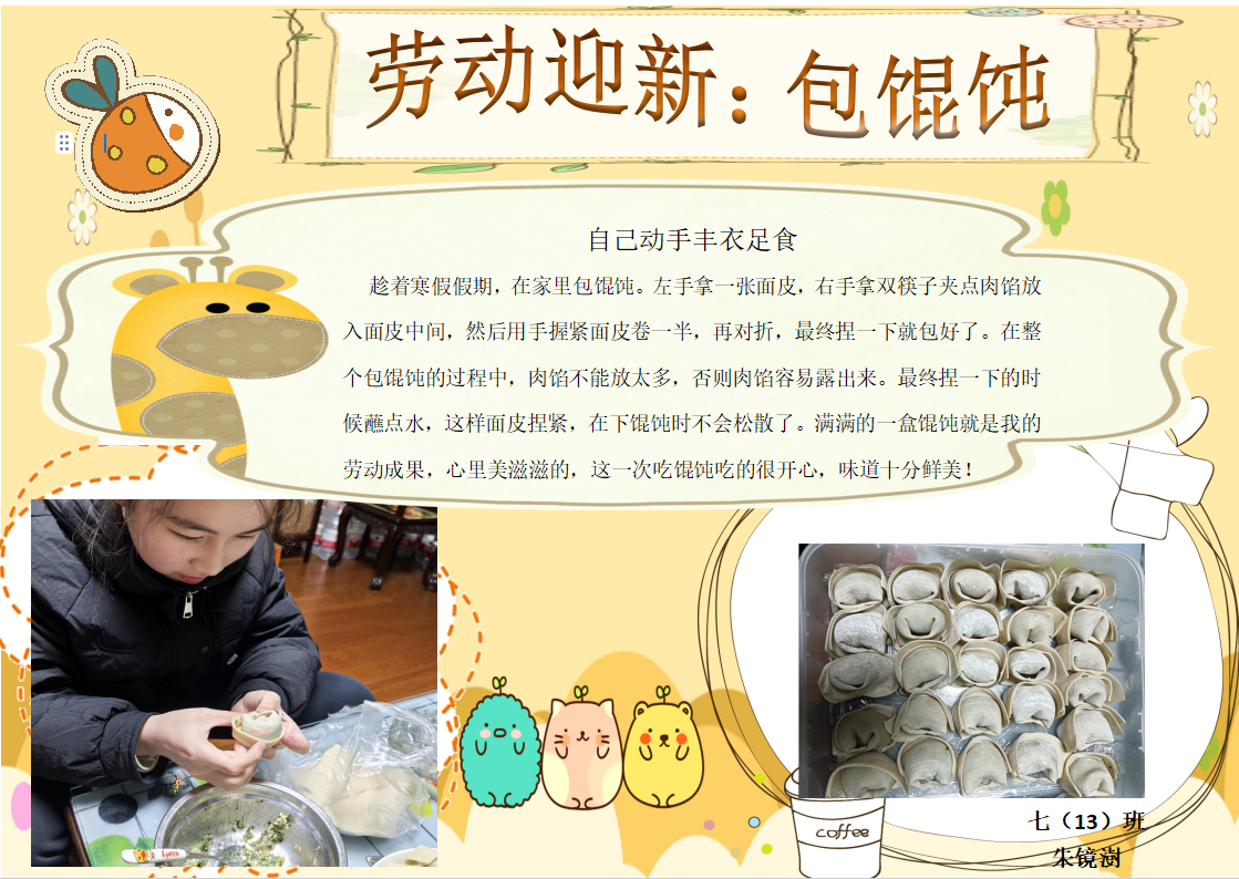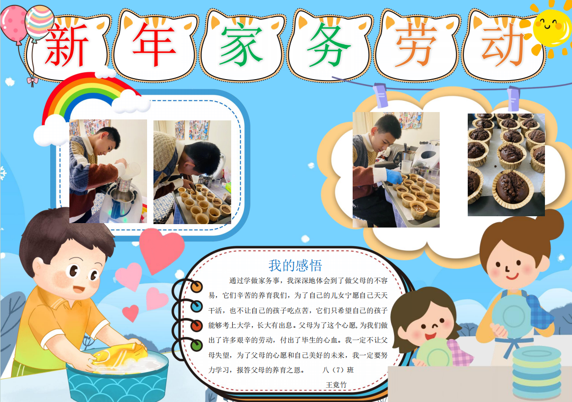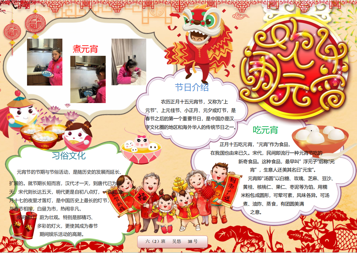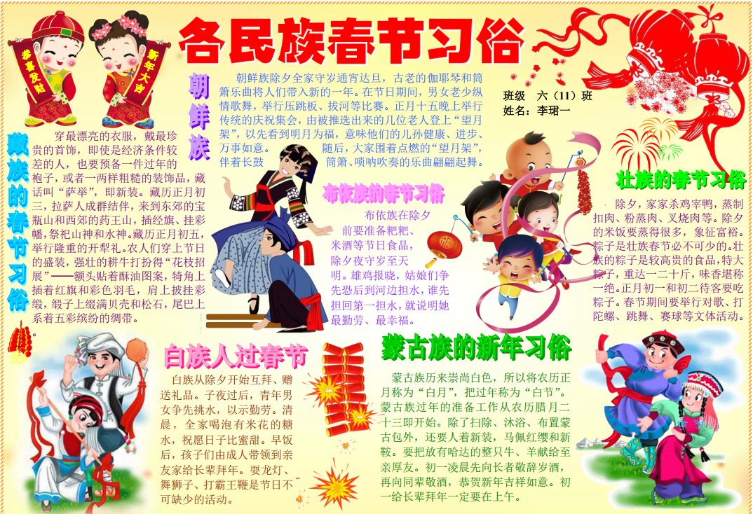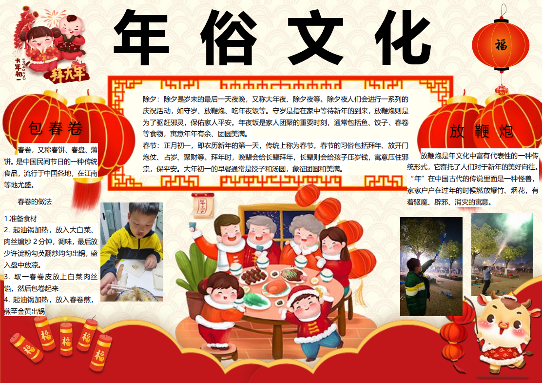在春节这场民俗盛宴中,更多的同学们将自己的春节民俗实践经历绘制成电子小报与迎新小报,呈现自己对传统年俗文化的生动诠释。那些传统习俗,如劳动迎新时的忙碌身影、包饺子做馄饨的温馨场景、逛庙会时的热闹欢腾、放烟花时的绚丽瞬间,皆被同学们用灵动的笔触、丰富的色彩与精妙的文字,一一呈现在小报之上。喜庆的氛围跃然纸上,浓浓的年味扑面而来。每一份小报都是同学们对春节文化的独特理解,是他们对新年最美好的祝福,亦是对传统民俗文化的传承与弘扬。让我们一同欣赏这些小报,感受民俗文化的独特魅力,领略同学们笔下新春的无限生机与活力。