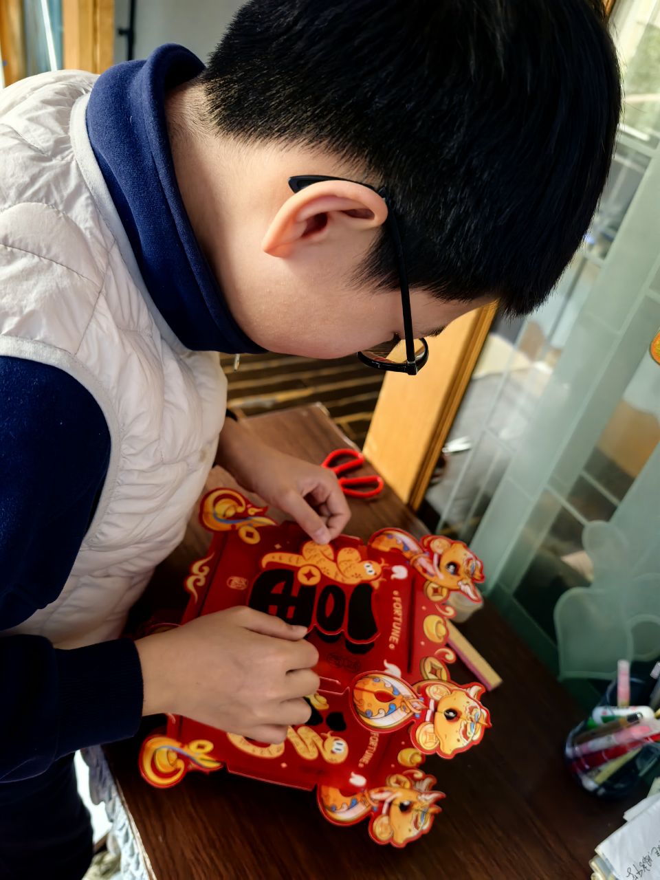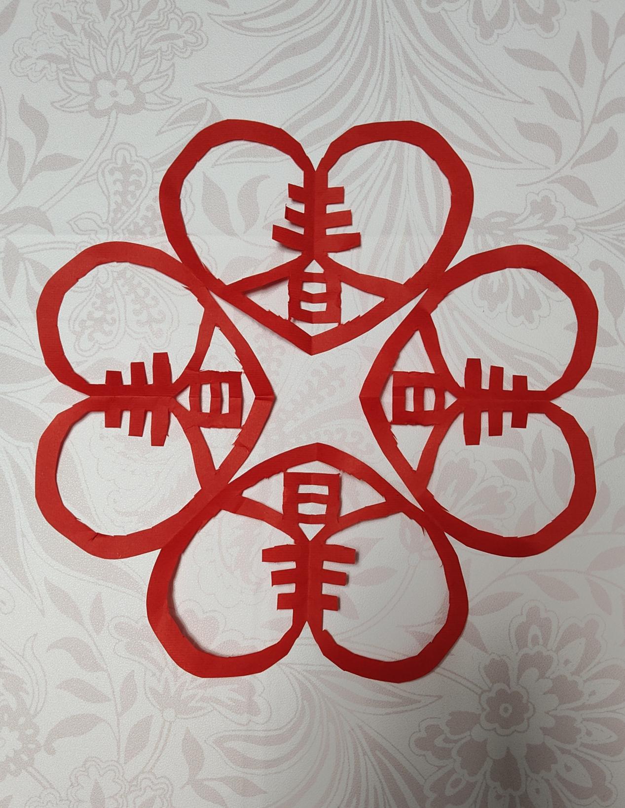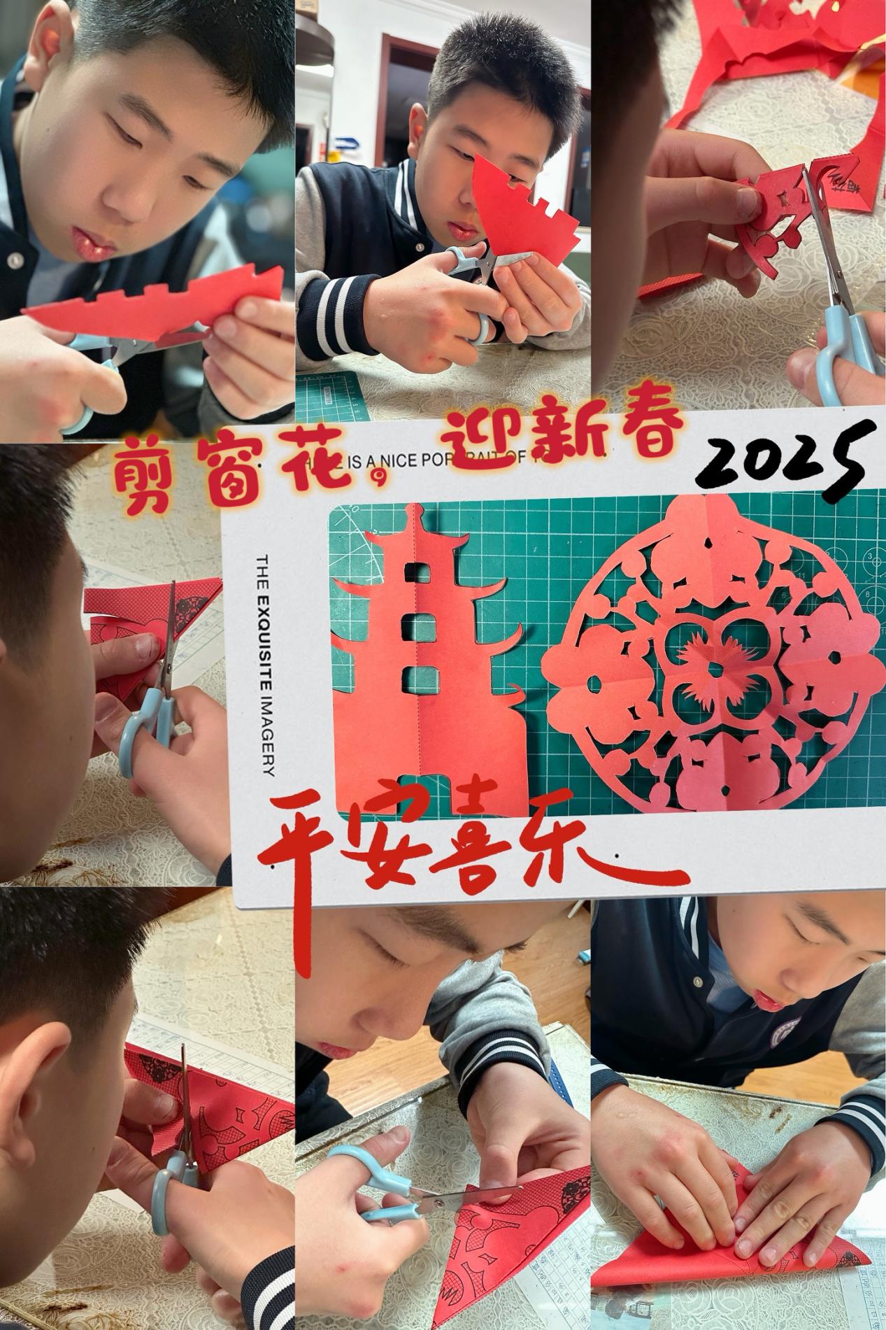 剪窗花,作为春节一项历史悠久的传统习俗,承载着人们对新春佳节的美好期盼。一张张普通的红纸,在同学们充满创意的巧手中,瞬间化作了令人赞叹的精美窗花。同学们手持剪刀,神情专注,精心裁剪,宛如一个个小艺术家。福字生肖等传统图案更是寓意满满,传递着对新岁的美好祝愿。尤其值得一提的是,有的同学匠心独运,巧妙地将蛇年元素融入其中,设计出别具一格的创意窗花,完美地把传统韵味与现代创意相融合。当这些窗花贴在窗户上,阳光透过,映照出五彩斑斓的光影,为家中增添了一抹亮丽的色彩,也让春节的气息更加浓郁。