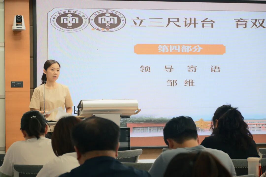 梅陇中学副校长邹维在寄语中,对全体新教师与导师提出三点期望:一是以教育家精神铸魂,做心怀大爱的“启蒙者”;二是以专业成长为纲,做勤学善思的“实践者”;三是以师徒结对为桥,做教学相长的“同行者”。她强调,教育并非单向的付出,而是心与心的共鸣、生命与生命的互相成就。邹校长勉励新教师珍惜这段宝贵的成长历程,在学习与实践中不断超越自我,书写属于自己的教育篇章。