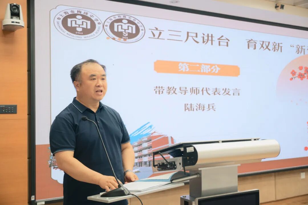 优秀带教导师代表陆海兵老师的发言睿智而温暖,他将师徒缘分比作一场美好的双向奔赴,并深情阐释了“徒弟”的“徒”,亦是“徒步”的“徒”。在他看来,师徒关系不仅是一教一学的传承,更是一段携手同行的旅程。师徒相伴,共同在教育的道路上探索、前行,彼此扶持,共历风雨。作为导师,他将肩负起“传帮带”的责任,不仅传授教学经验,更以身作则,传递教育的温度与情怀,陪伴新教师走好职业生涯的第一程。