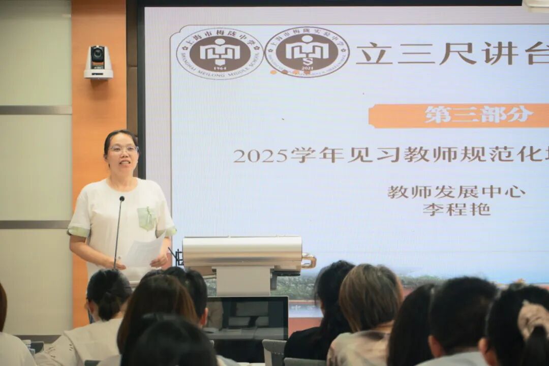 紧接着,教师发展中心副主任李程艳老师对今年见习教师规范化培训方案进行了详尽解读。本次培训将围绕 “浸入式培训、团队带教、文化熏陶、自主反思”四大模块展开,通过全方位的浸润学习、多元的导师团队引领、深厚的校园文化陶冶以及持续的自主反思,助力新教师快速成长、尽快融入教育岗位。李主任同时明确了各阶段的考核要求,为见习教师的成长路径提供了清晰方向与实践指引。
