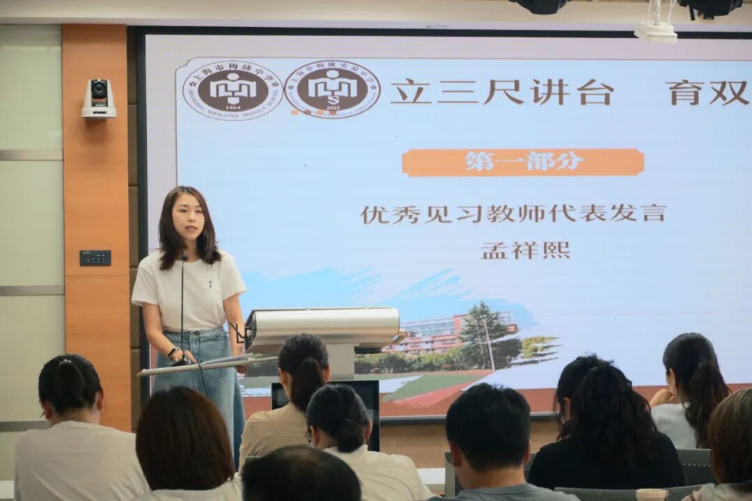 2024学年优秀见习教师代表孟祥熙老师以真挚的语言,回顾了自己从青涩到成熟的成长历程。那一纸“师徒结对”协议,成为她初登讲台时最坚定的依靠。在师父们的悉心指导和学校系统培训的支持下,她一步步将教育理论融入课堂实践,最终自信地站稳讲台。孟老师的成长足迹,不仅见证了个人的努力,更凝聚着学校与导师团队的悉心培育,生动诠释了“以师促教、以教促长”的育人理念。