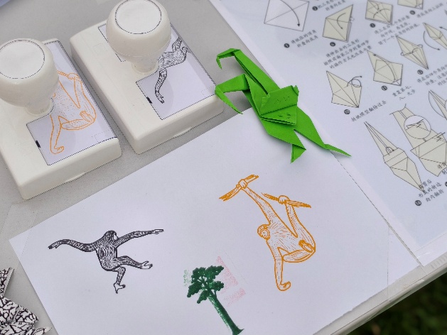 文创组的同学为帐篷巡展精心策划了互动活动,活动主要分为三个环节:折纸、涂色游戏,以及备受瞩目的盖章环节!通过简单的折纸和几笔涂色,游客便能深刻记住长臂猿的形象。特别设计的两款印章更是别具匠心:金色印章象征妈妈,黑色印章代表爸爸,巧妙地对应了动物园中白颊长臂猿的真实毛色。