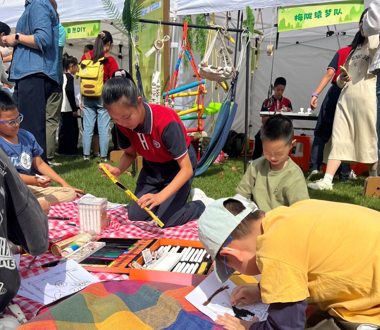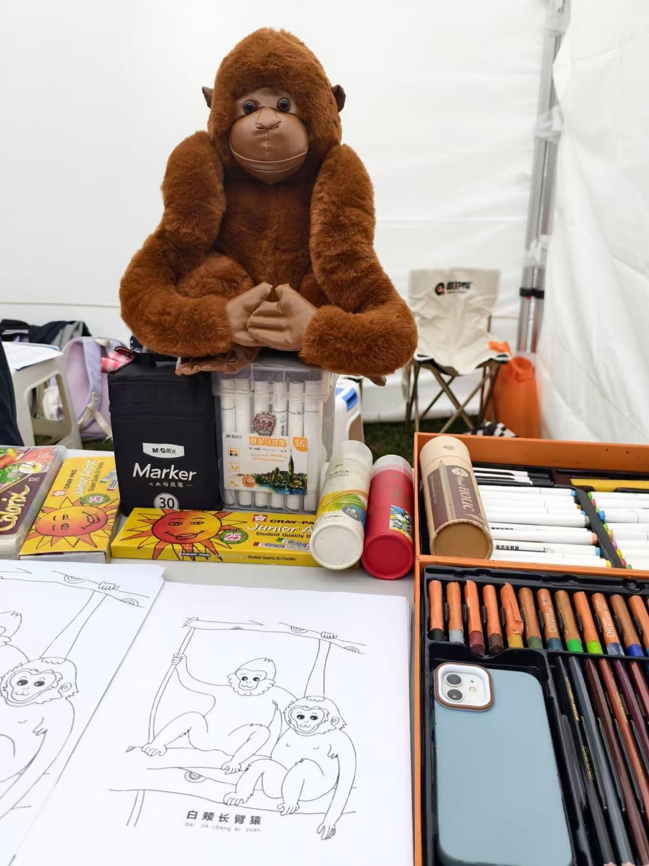 现场,大家满怀热情地向游客和专家介绍玩具设计的巧妙构思,演示其如何契合长臂猿的活动习性。此外,还特别邀请小朋友们一同触摸彩纸、进行涂鸦折纸,并参与集章互动,分享保护长臂猿的相关知识。在欢声笑语中,处处洋溢着对长臂猿守护的真挚热忱。