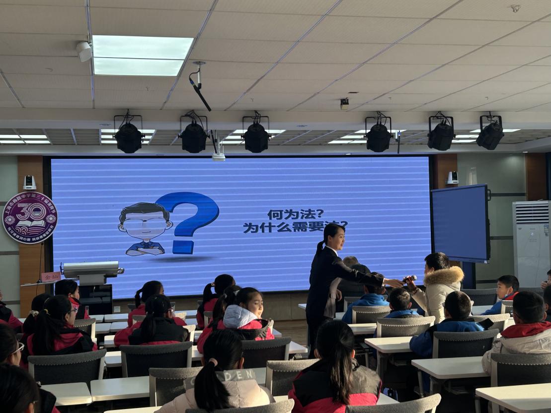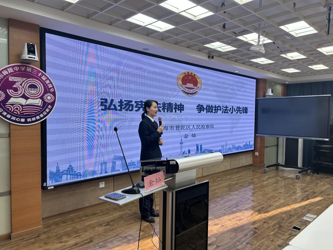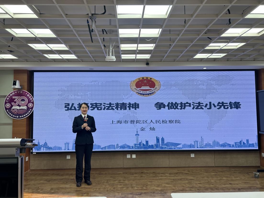 学校邀请了法治副校长,来自普陀区人民检察院的金灿老师开展专题讲座。金老师以鲜活案例,讲解宪法的起源、核心内容及与青少年成长的关联,助力师生深化对宪法的理解。