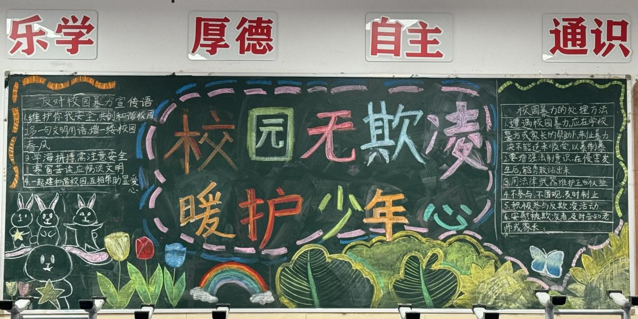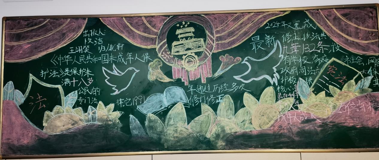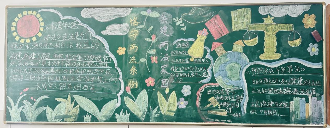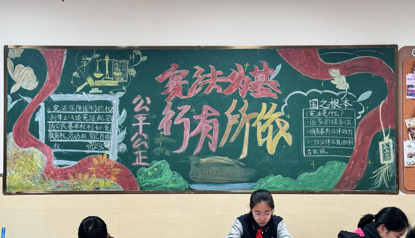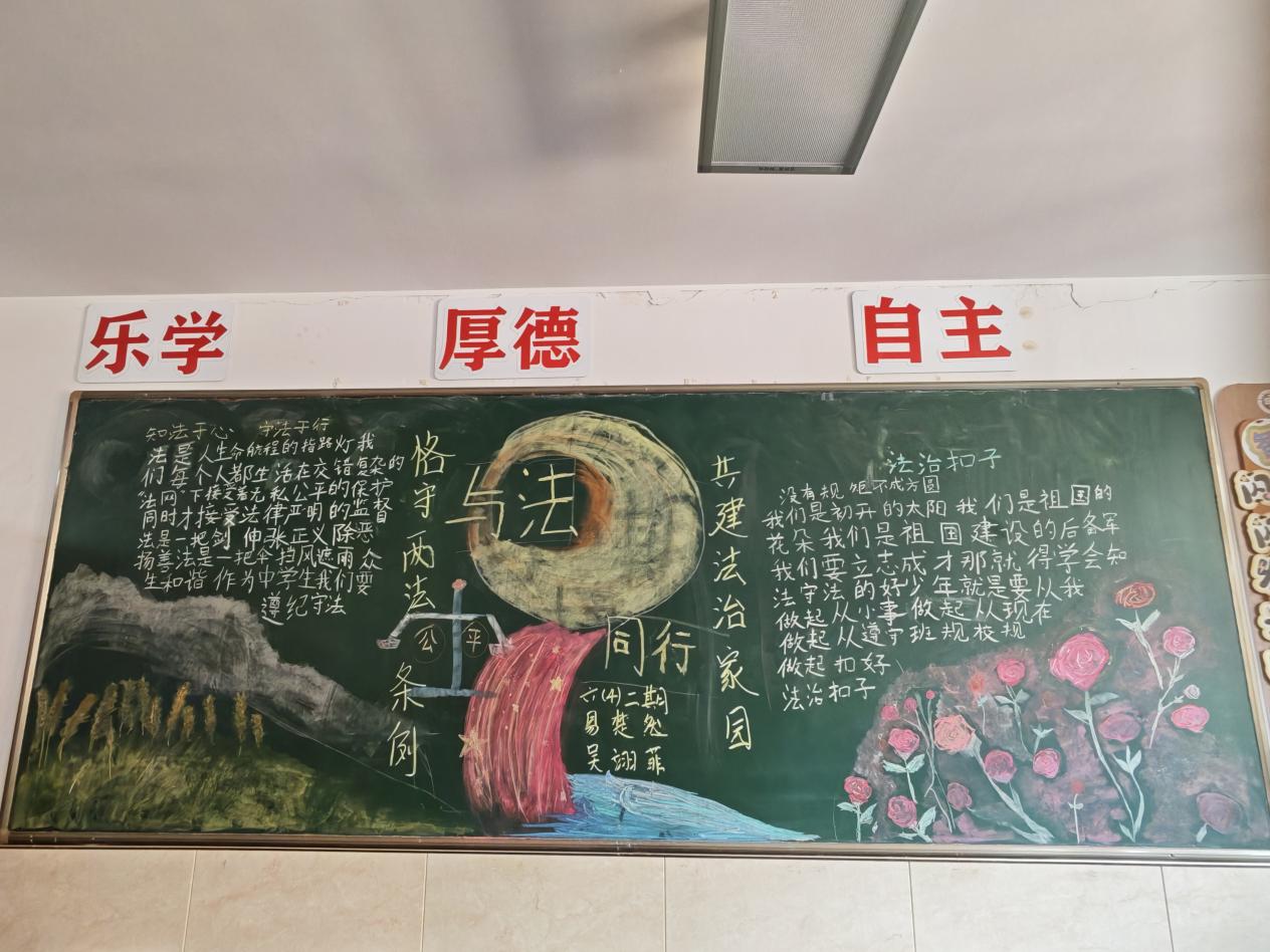 学校充分利用教室黑板报这一传统宣传阵地,设计了涵盖宪法知识、“两法一条例”、预防学生欺凌等主题的专题板报,使每一面黑板都成为生动的法治教育窗口。