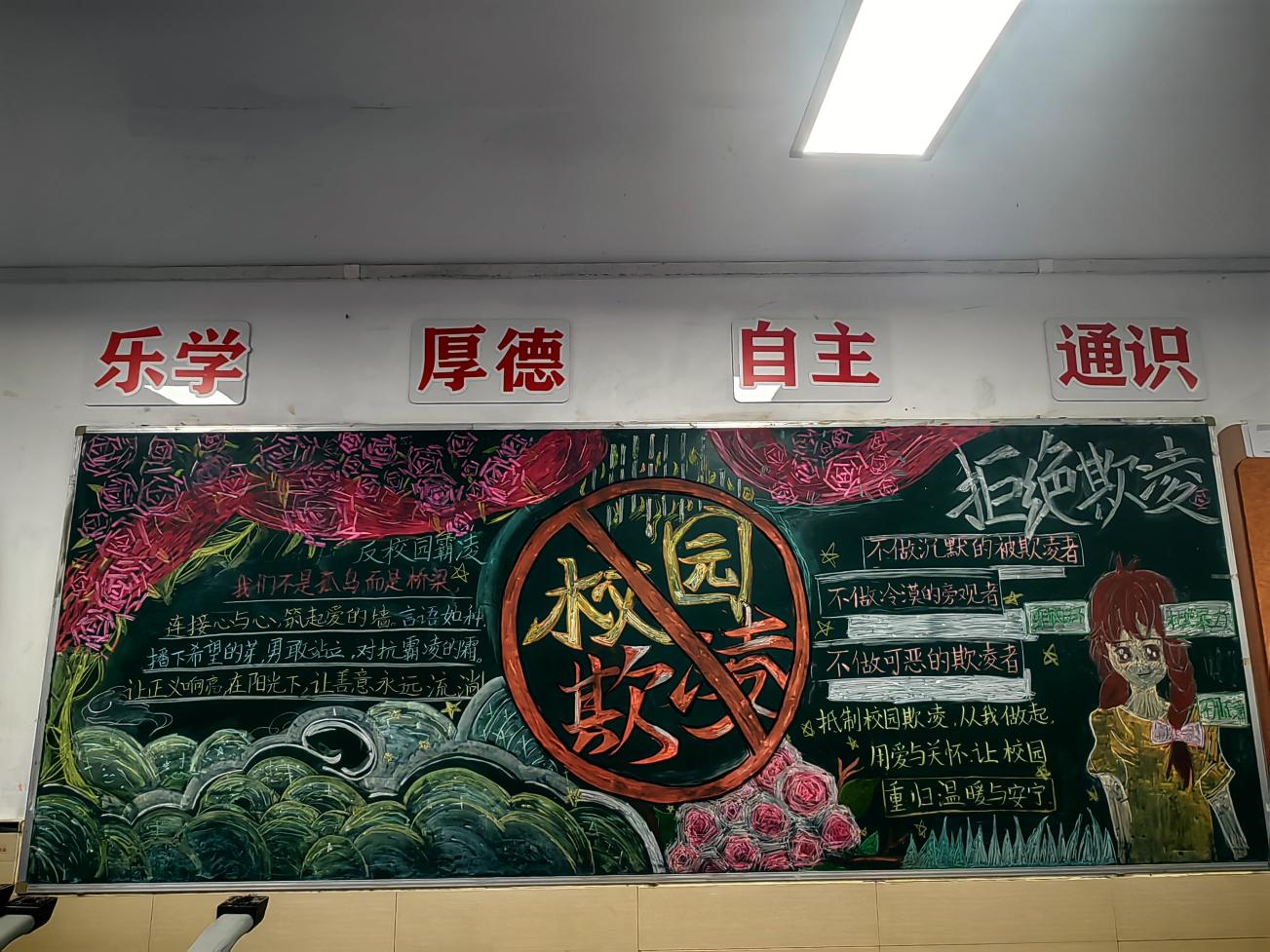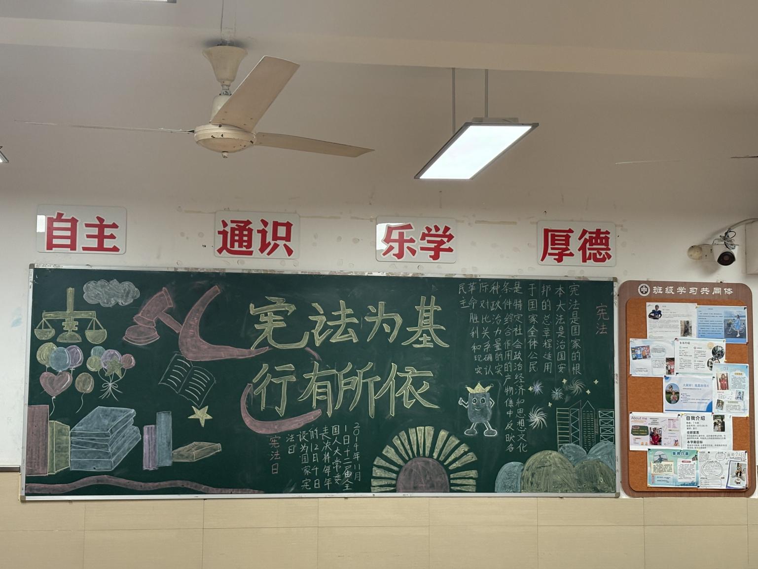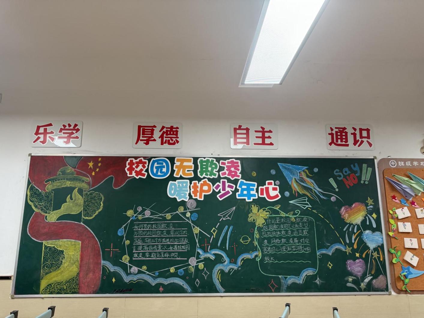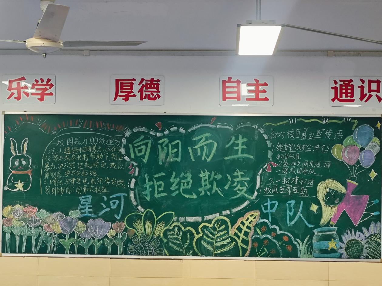 学校充分利用教室黑板报这一传统宣传阵地,设计了涵盖宪法知识、“两法一条例”、预防学生欺凌等主题的专题板报,使每一面黑板都成为生动的法治教育窗口。
